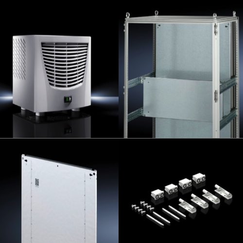 Rittal enclosure accessories include thermal management products, mounting plates, DIN rails, cable entry systems, grounding kits, door hardware, enclosure lighting, and plinth components for industrial and automation applications.