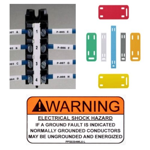 They include wire and cable labels, panel and equipment labels, safety and warning labels, terminal markers, and identification labels for industrial systems.