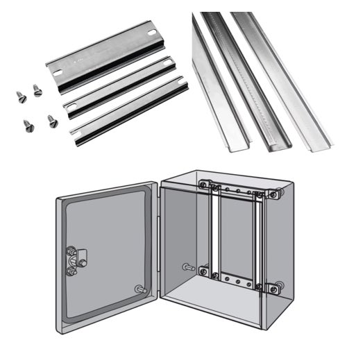 Hoffman DIN rail is mounted inside of control panels and enclosures to provide a means to install and secure electrical and automation equipment. DIN rail is commonly found in control cabinets and electrical enclosures as it provides a common method of mounting terminal blocks, relays, power supplies, circuit protection and other control equipment. DIN rail allows for clean installations and ensures that control equipment is properly mounted to the enclosure.