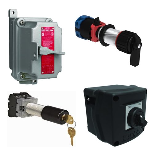 They are available in multiple pole/throw options with actuator styles including rotary, paddle, and mushroom operators to suit varied control needs.