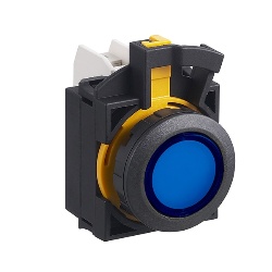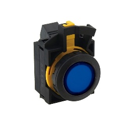 Blue illuminated industrial push button operator with metal bezel, panel-mount design, and rear contact block, used for control panel and machinery interface applications.