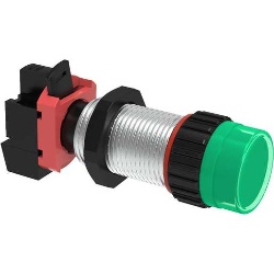 Green panel-mount push button operator with threaded metal body, retaining nut, and rear-mounted contact block, designed for industrial control panel and machinery start/stop applications.