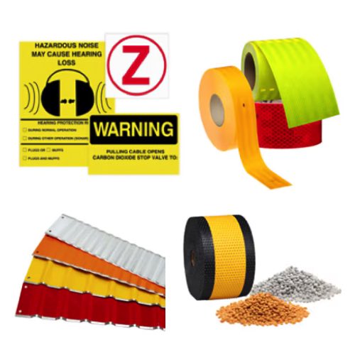 3M industrial safety signage and markings include hazard warning signs, floor and aisle marking tapes, anti-slip tapes, visual instructions, regulatory labels, and pipe markers used to communicate hazards and designate safe areas.