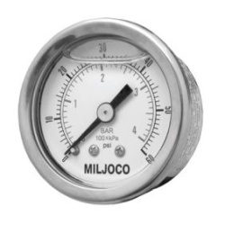 Pressure gauges made of stainless steel are tough and can withstand corrosion. This makes them appropriate for the kinds of environments and processes that are unkind to equipment, such as those involving chemicals and other aggressive fluids that can attack metal under certain conditions. Liquid-filled gauges are also good candidates for these processes, especially if they might vibrate or pulse. The fluid inside the gauge (usually glycerin or silicone) dampens the needle's movement, allowing it to settle at a more stable reading than if the needle were to dance around in the unfilled gauge.