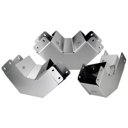 A product collage on a light gray background showing several silver metal cable tray or wireway fittings. The image includes multiple angled junction pieces, corner sections, bracket-like mounting parts, and one long straight rectangular section.