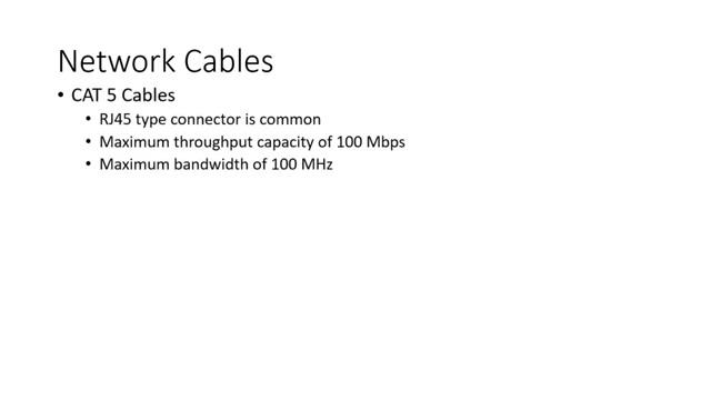 [1m:15s] CAT5 cables have a maximum speed throughput of 100 megabits per second with a bandwidth potential of up to 100 megahertz. It is important to note that CAT5 network cables are largely obsolete. This cable has been replaced with newer cables that have more capability. However, it is still very common to see CAT5 cables being used in many networks.