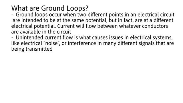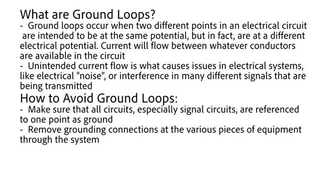 [0m:44s] We hope that by the end of this video, you will have a better understanding of this topic as well as how to avoid ground loops in your electrical systems, and also what you might do in the event you encounter ground loops. According to the IEEE standards, in an electrical system, a ground loop or earth loop occurs when two points of a circuit, both intended to be at ground reference potential, have a potential between them. This means that two different points in an electrical circuit are intended to be at this same potential, but in fact are at a different electrical potential, which will cause current to flow between them. This current will flow through whatever conductors are available in the circuit.