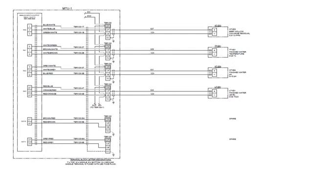 [4m:24s] Analog is a range so it could be anywhere between one and 100. This is typically represented as a 4 to 20 milliamp signal and then that is scaled to meet your specific range. It doesn't have to be 4 to 20 milliamps, it could be a different type of signal, but that's one of the most common. So in this case, you can see this bottom one here. We have water level that's going to be sending somewhere between a 4 and a 20 milliamp signal back to our PLC on one of these wires. One of these wires here is going to be a signal wire, the other one's going to be tied to ground. You can see this bottom one looks like it's our ground wire, and this top one is going to be the actual signal wire. Okay, so that's essentially what's happening in this diagram. In the middle here you'll see some terminal blocks. These are used just as an interface between our instrument in the field and the PLC, so we're not wiring directly from the instrument to the PLC, we're wiring to these terminal blocks. In this case, these are multilevel terminal blocks. So that's essentially what's happening here. I know that there's a lot to look at, and it looks very complex when you look at it, but it's simply just some simple signals coming back to an analog input card on a PLC. Now let's look at our next example.