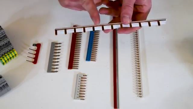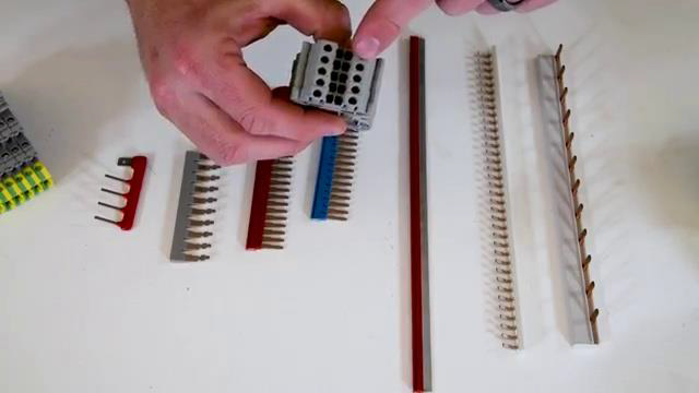 [1m:10s] For instance, if we only have a length of three or four terminal blocks that we need to jumper, we can simply cut this length of jumpers to meet the need that we have. We can also clip out these pins that jumper into the actual terminal blocks. Let me show you how we use terminal block jumpers with terminal blocks. As you can see here, I have a set of five or 6 standard pass through terminal blocks.
