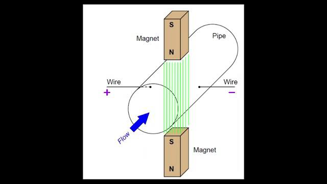 [4m:37s] However, the basics of the mag flow meter are again this: an electromagnetic field is generated which when a given substance is flowing through the pipe causes positively and negatively charged particles to collect on opposite sides of the piping. This effect induces a certain voltage level that is measured by two electrodes on opposite sides of the meter.