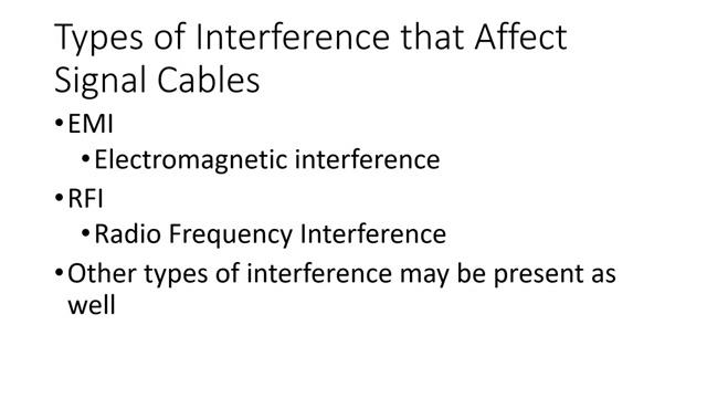 [1m:9s] In many cases, cable or wire that need to carry signal data are more sensitive and prone to interference or disturbances. This interference can come from many different sources, such as other electronic devices or cables that carry power. Sometimes this interference is referred to as electromagnetic interference or EMI.