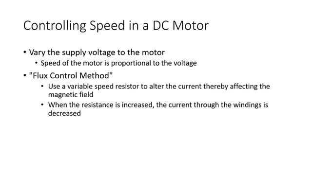 [1m:37s] is determined by the incoming current to the field windings in the motor. This current can be varied by using a variable speed resistor.