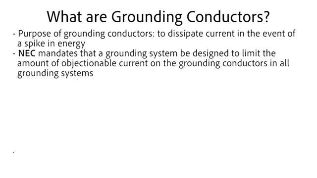 [1m:46s] Based off of this description and what we know to be true about grounding systems, the purpose of grounding conductors is to dissipate current in the event of a spike in energy such as a lightning strike or power surge.