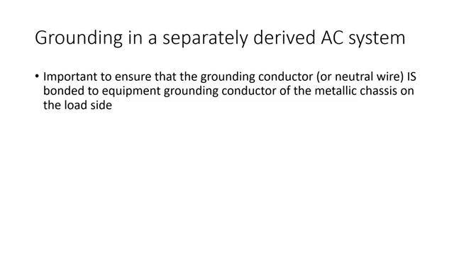 [2m:8s] When grounding in a separately derived AC system, which is a system where components such as a generator can have the grounded conductors or neutral wires, continuity interrupted possibly by a transfer switch. It is important to make sure that the grounding conductor or the neutral wire is bonded to equipment grounding conductor of the metallic chassis on the load side of the electrical service through the use of a main bonding jumper.