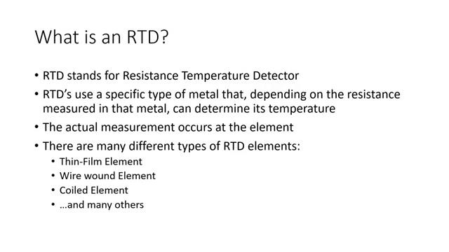 [1m:2s] In this video we will talk about what hardware makes up the RTD and how it works. We will also discuss some of the reasons RTDs are used instead of other temperature devices such as thermocouples or thermistors. At its core RTDs use a specific type of metal that depending on the resistance measured in that metal can determine the temperature. The actual measurement occurs at the element, which is a portion of the device that actually is able to collect the data needed to provide accurate temperature readings. There are many different types of RTDs, some more common than others. A few examples are first, the thin film element which uses a very thin layer of resistive metals adhered to a substrate, typically ceramic, then coated in glass or epoxy.