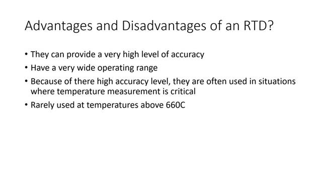 [3m:43s] Also, because of their high accuracy level, they are often used in situations where temperature measurement is critical. A few disadvantages include the fact that RTDs are rarely used at temperatures above 660 degrees Celsius. Above this temperature, it can become difficult to prevent the metal from becoming contaminated by the metal sheath surrounding the RTD element. Also at lower temperatures, RTDs do not provide the same level of accuracy or resolution as thermistors, which is another type of temperature measurement device.