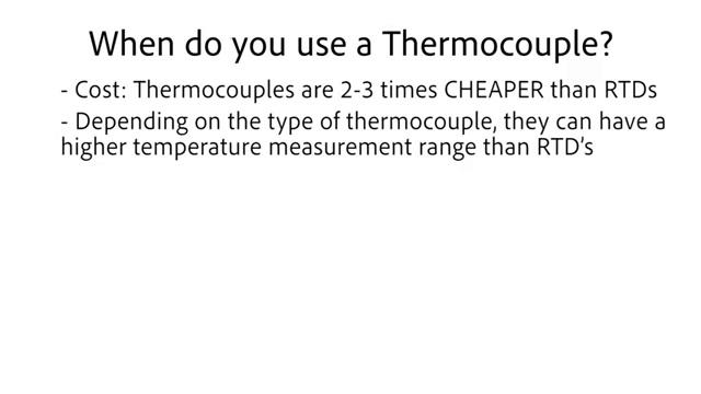 [3m:1s] Also depending on the type of thermocouple that is being used, they can have a higher temperature measurement range than RTDs. For example, Noble metal thermocouples can measure temperatures as high as 3100 degrees Fahrenheit.