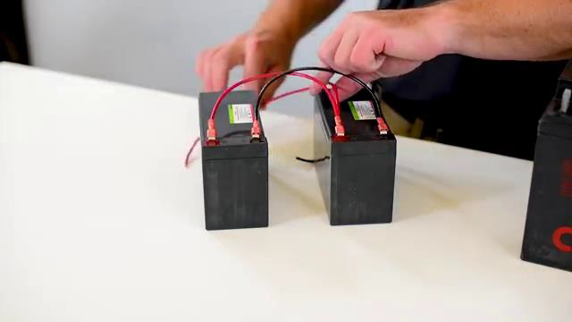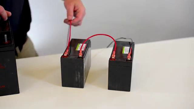 [1m:37s] Once we have determined the voltage requirements and capacity or AMP hour requirements of our system, we can then determine how many batteries we need to use in the specific wiring configuration for that particular system. First let's start with voltage. Let's assume we have a basic 12 Volt system. In this case, we would only need one 12 Volt battery. Let's assume we have now a 24 Volt system. In this case, we would need two 12 Volt batteries to produce that 24 volts. Let me demonstrate how we would wire these two batteries together in order to produce 24 volts. For example, in this particular setup, we have two 12 Volt batteries. n order to produce the 24 Volt that is required, we need to wire these batteries in series. Let me demonstrate how we're going to do that.