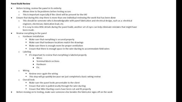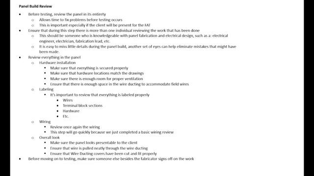 [1m:33s] This allows us time to fix any problems before the actual testing occurs. This is going to be really important, especially if we have the client present for our factory acceptance testing, which is very common in a lot of different scenarios. So, again reviewing the panel in its entirety before the testing is started is a very very good idea and something we do on every one of our panels. Something else we want to consider during this step is that we make sure that we have more than one individual participating in this panel review. We have found that it's easy for the fabricator to miss little things during the fabrication process and if you have another set of eyes on that panel, you can more easily find those possible mistakes and fix those, again, before we start any testing. The person that we involve in this review process should be someone who's very knowledgeable with the panel fabrication process, such as an electrical engineer, an electrician, or possibly your fabrication lead. Someone like that, who really understands electrical design.