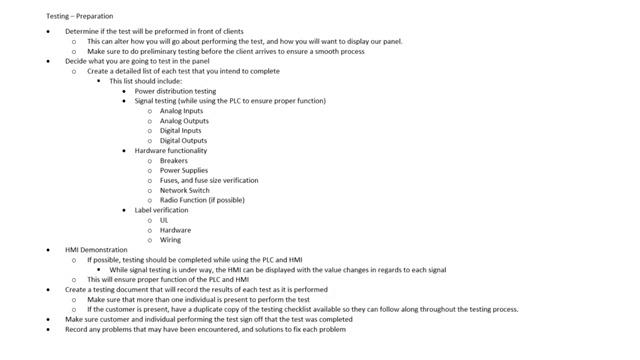 [1m:59s] Once we know if the client is going to be there or not, then we can start to determine how we're going to test our panel. Some big things that we need to look for and some things that we need to do is we need to create a detailed list. Everything that we intend to test in the panel. Now, if the client is present, this may be slightly different than our internal testing, but for the most part, this should be about the same either way. We want to create this list. Now, this list should include things like all of the power distribution testing, that's AC power DC power, everything that's associated with our power distribution we want to put on this list. Any kind of signal testing that we're going to do for this particular test. We should plan on using making sure, the PLC is involved and the PLC has any of the software that's been programmed all that's functioning properly before we do this testing. We're going to test all our analog inputs and outputs. We're going to test our digital inputs and outputs. So, all of this should be on this list that we're creating. Hardware functionality: we want to make sure that we list things like our breakers, power supplies, fuses, view size verification, also breaker size verification,