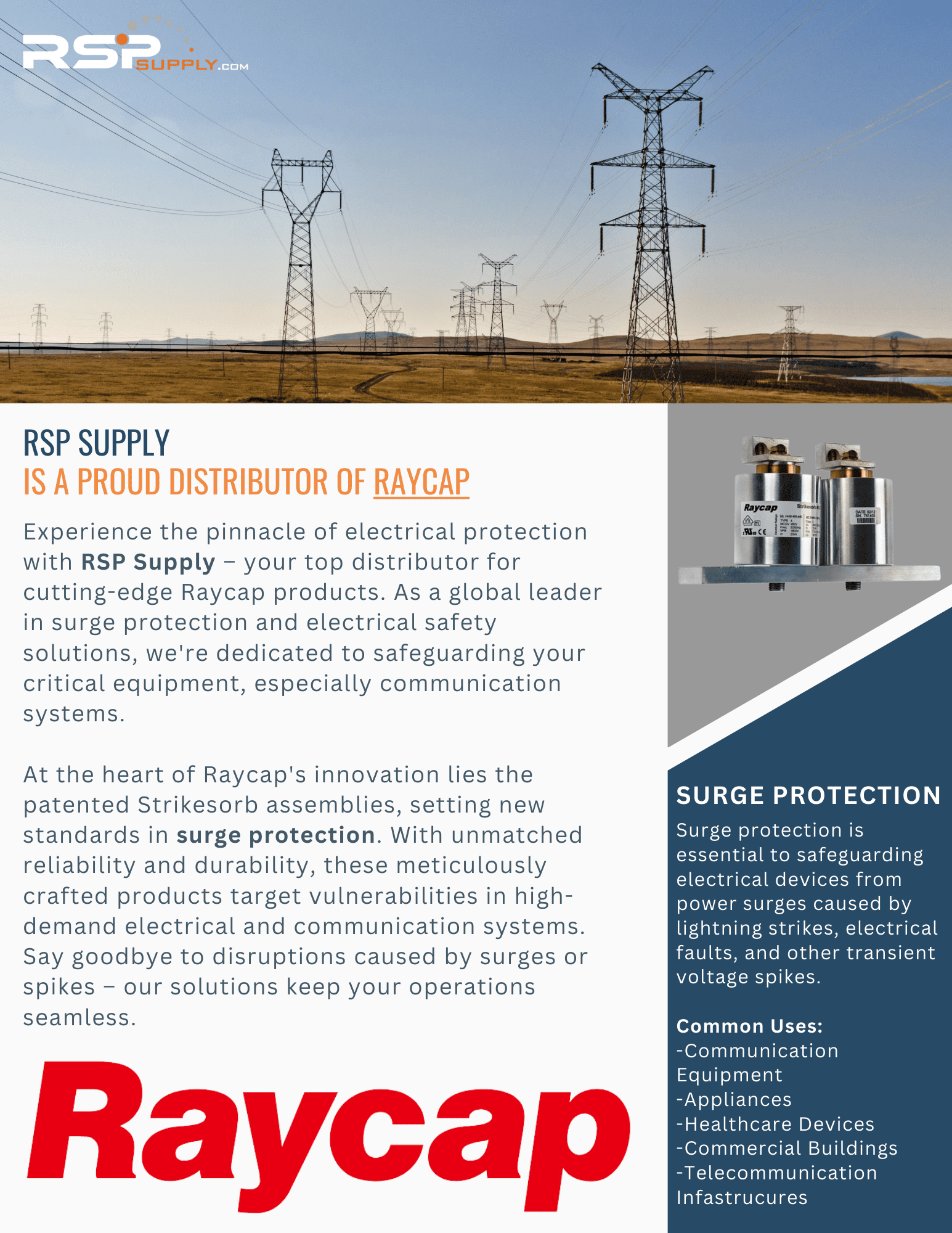 RSP Supply is a proud distributor of Raycap: Experience the pinnacle of electrical protection with RSP Supply – your top distributor for cutting-edge Raycap products. As a global leader in surge protection and electrical safety solutions, we're dedicated to safeguarding your critical equipment, especially communication systems. At the heart of Raycap's innovation lies the patented Strikesorb assemblies, setting new standards in surge protection. With unmatched reliability and durability, these meticulously crafted products target vulnerabilities in high-demand electrical and communication systems. Say goodbye to disruptions caused by surges or spikes – our solutions keep your operations seamless.
