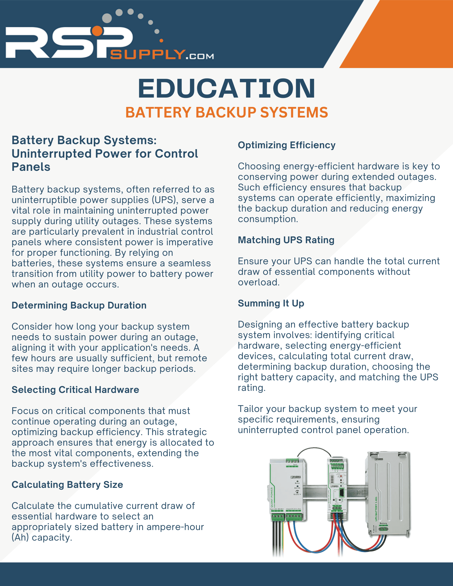 Summing It Up: Designing an effective battery backup system involves: identifying critical hardware, selecting energy-efficient devices, calculating total current draw, determining backup duration, choosing the right battery capacity, and matching the UPS rating. Tailor your backup system to meet your specific requirements, ensuring uninterrupted control panel operation.