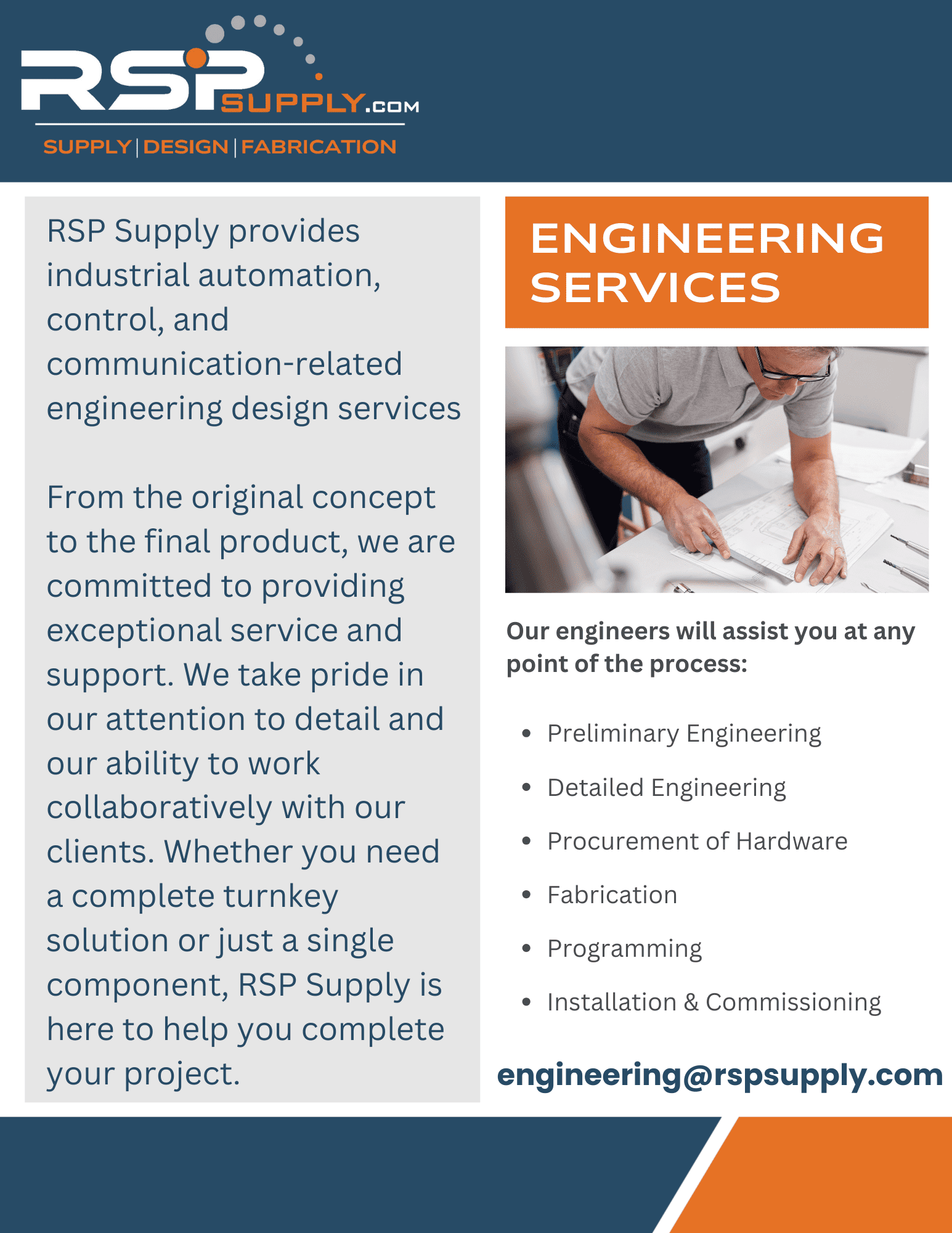 Engineering Services: RSP Supply provides industrial automation, control, and communication-related engineering design services. From the original concept to the final product, we are committed to providing exceptional service and support. We take pride in our attention to detail and our ability to work collaboratively with our clients. Whether you need a complete turnkey solution or just a single component, RSP Supply is here to help you complete your project.