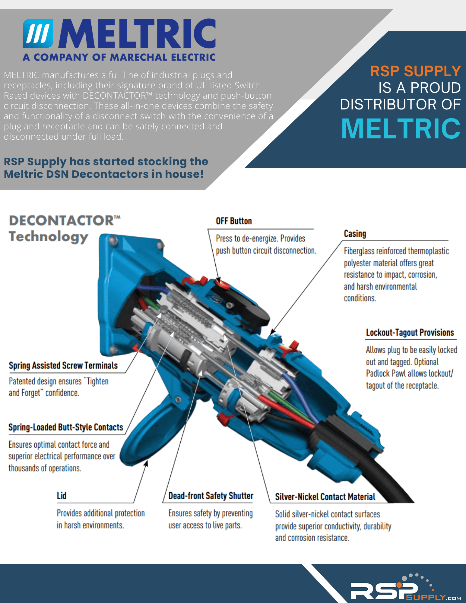 RSP Supply is a proud distributor of Meltric: MELTRIC manufactures a full line of industrial plugs and receptacles, including their signature brand of UL-listed Switch-Rated devices with DECONTACTOR™ technology and push-button circuit disconnection. These all-in-one devices combine the safety and functionality of a disconnect switch with the convenience of a plug and receptacle and can be safely connected and disconnected under full load. RSP Supply has started stocking the Meltric DSN Decontactors in house!