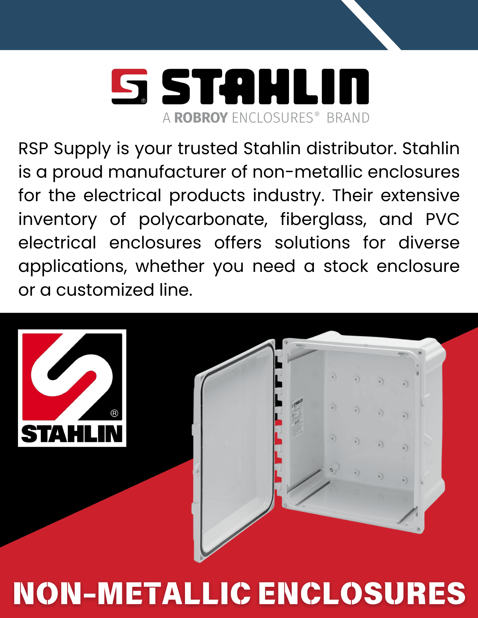 Stahlin: RSP Supply is your trusted Stahlin distributor. Stahlin is a proud manufacturer of non-metallic enclosures for the electrical products industry. Their extensive inventory of polycarbonate, fiberglass, and PVC electrical enclosures offers solutions for diverse applications, whether you need a stock enclosure or a customized line.