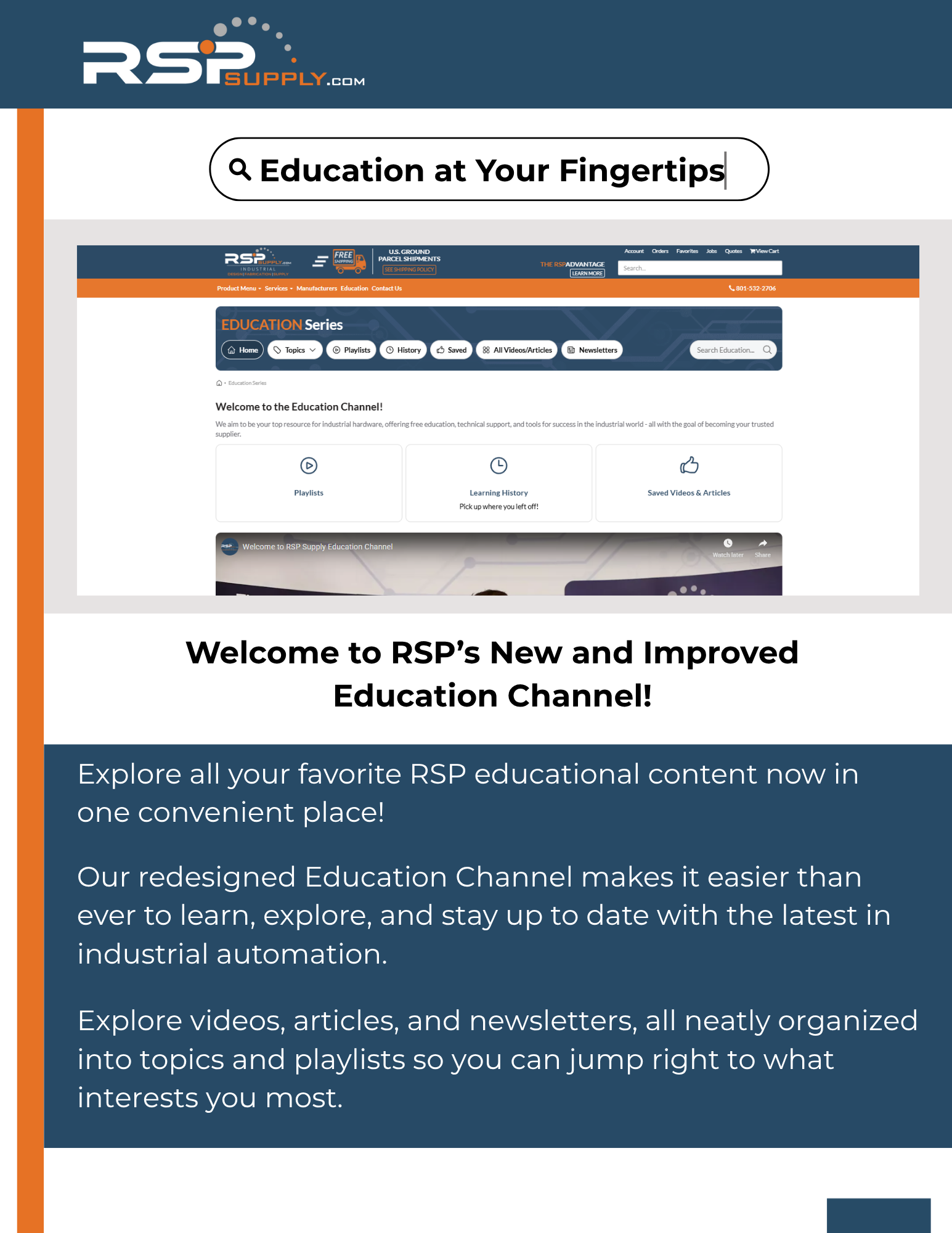 Education at Your Fingertips: Welcome to RSP's New and Improved Education Channel! Explore all your favorite RSP educational content now in one convenient place! Our redesigned Education Channel makes it easier than ever to learn, explore, and stay up to date with the latest in industrial automation. Explore videos, articles, and newsletters, all neatly organized into topics and playlists so you can jump right to what interests you most.