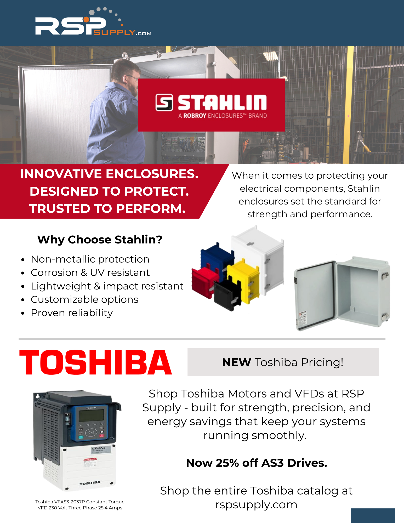 Shop Toshiba Motors and VFDs at RSP Supply - built for strength, precision, and energy savings that keep your systems running smoothly. Now 25% off AS3 Drives. Shop the entires Toshiba catalog at rspsupply.com