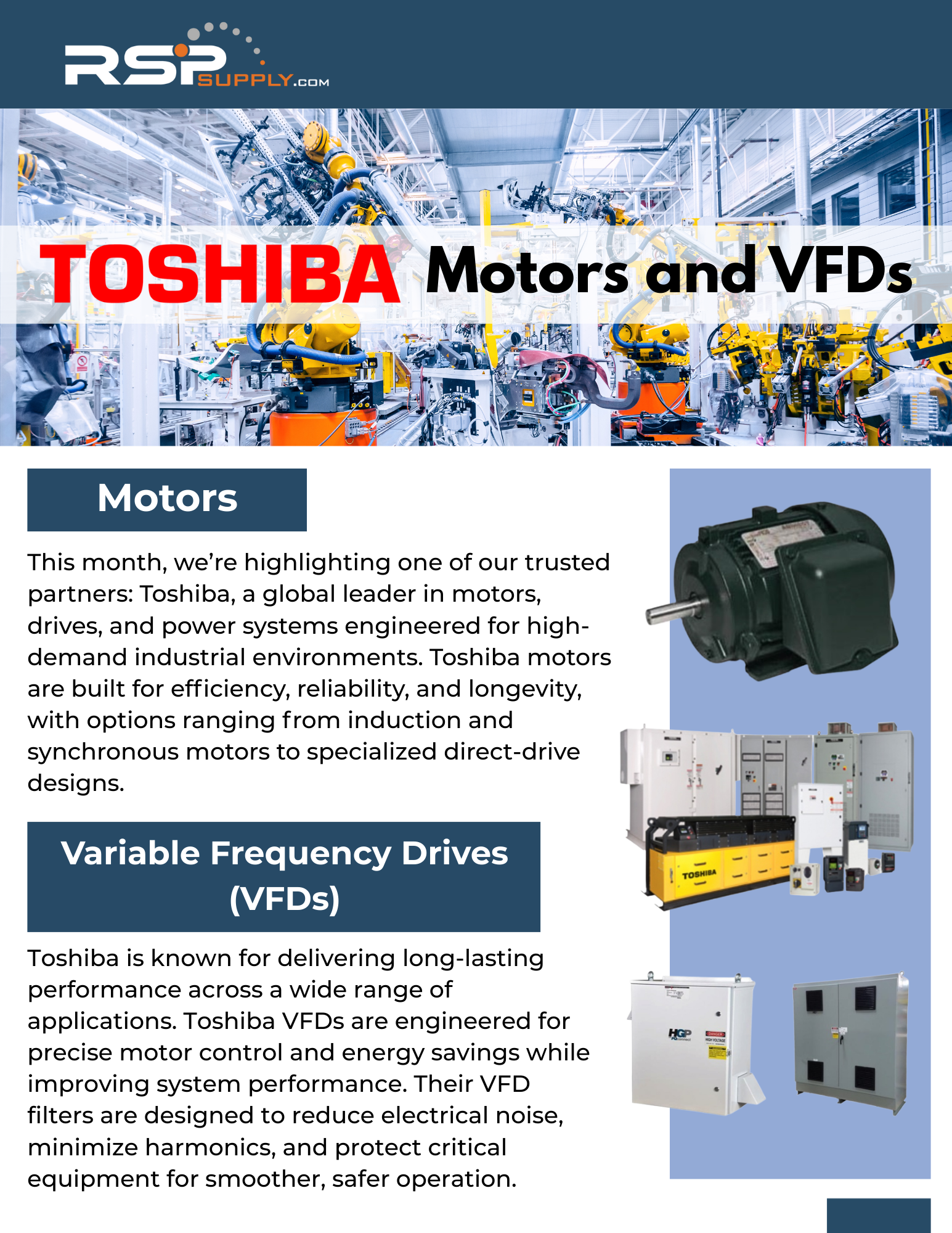 Motors: This month, we're highlighting one of our trusted partners: Toshiba, a global leader in motors, drives, and power systems engineered for high-demand industrial environments. Toshiba motors are built for efficiency, reliability, and longevity, with options ranging from induction and synchronous motors to specialized direct-drive designs.