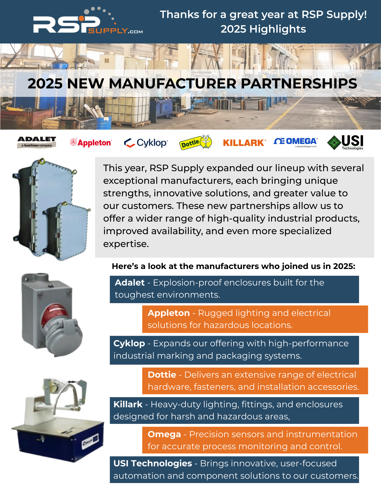 This year, RSP Supply expanded our lineup with several exceptional manufacturers, each bringing unique strengths, innovative solutions, and greater value to our customers. These new partnerships allow us to offer a wider range of high-quality industrial products, improved availability, and even more specialized expertise.