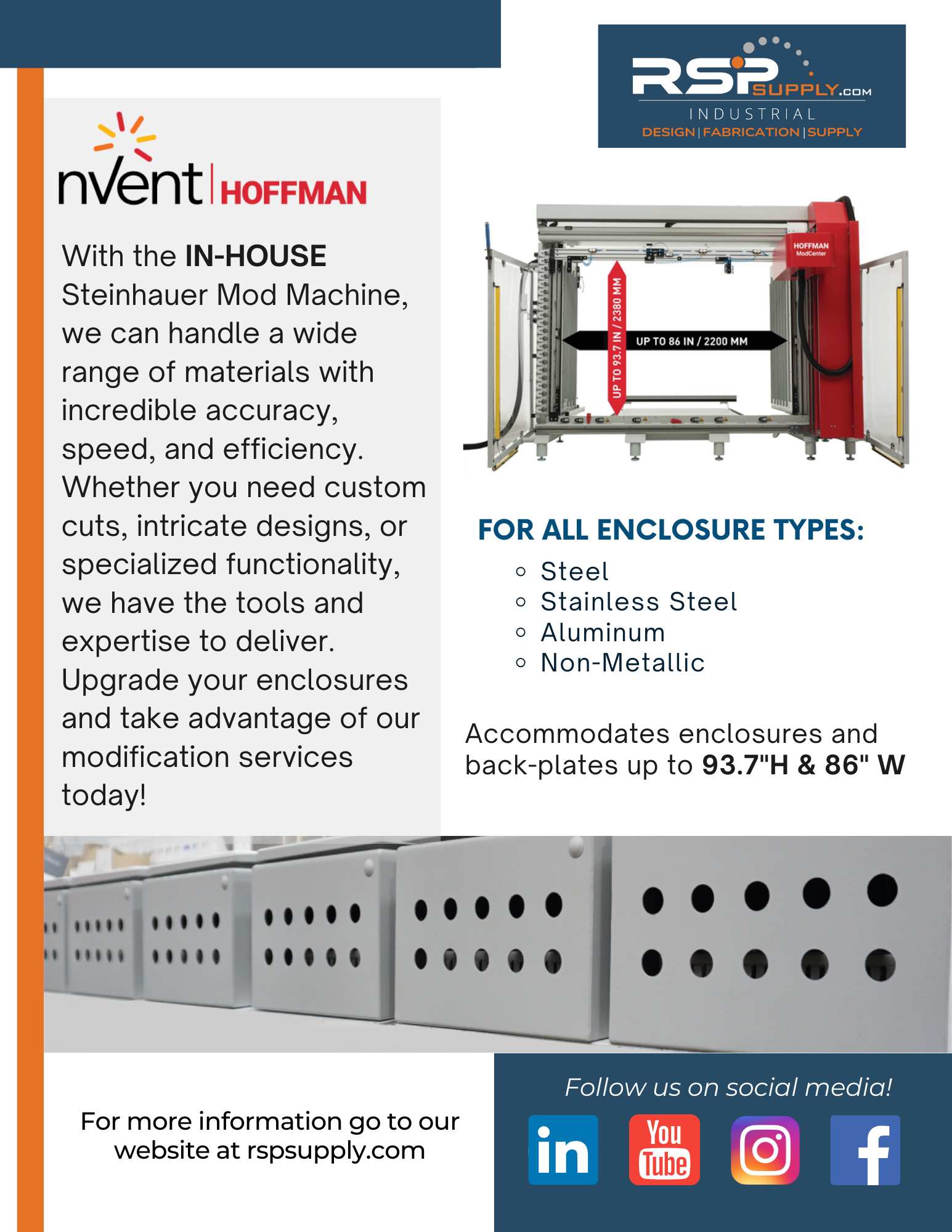 nvent Hoffman - With the in-house Steinhauer Mod Machine, we can handle a wide range of materials with incredible accuracy, speed, and efficiency. Whether you need custom cuts, intricate designs, or specialized functionality, we have the tools and expertise to deliver. Upgrade your enclosures and take advantage of our modification services today!