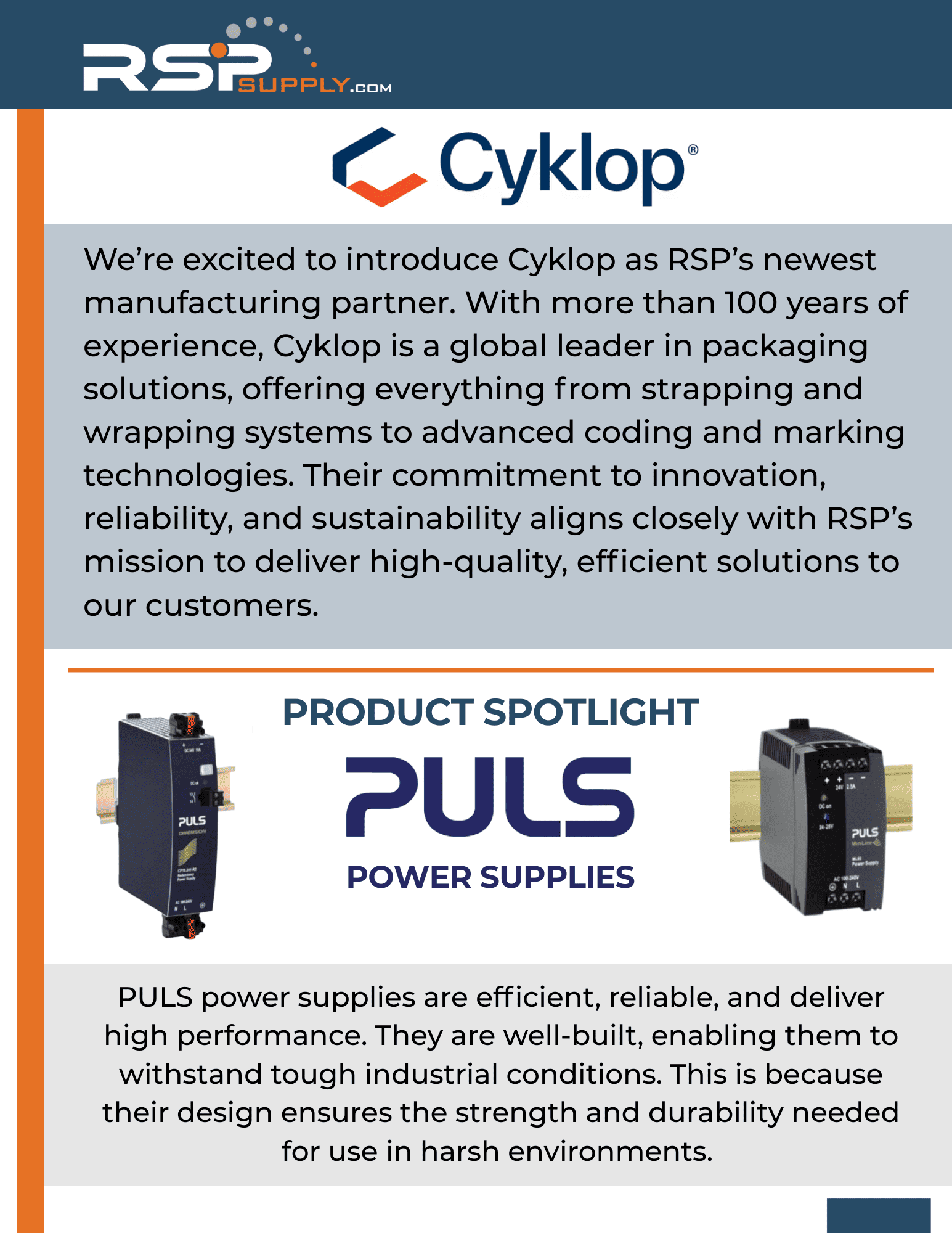 In this month's issue we are excited to spotlight a new manufacturer that we are partnering with! Cyklop's sustainable packaging is a leading global provider of packaging machinery and supplies. Another manufacuturer spotlight this month is PULS power supplies. As always don't forget to check out our social media for updates on RSP Supply every week.