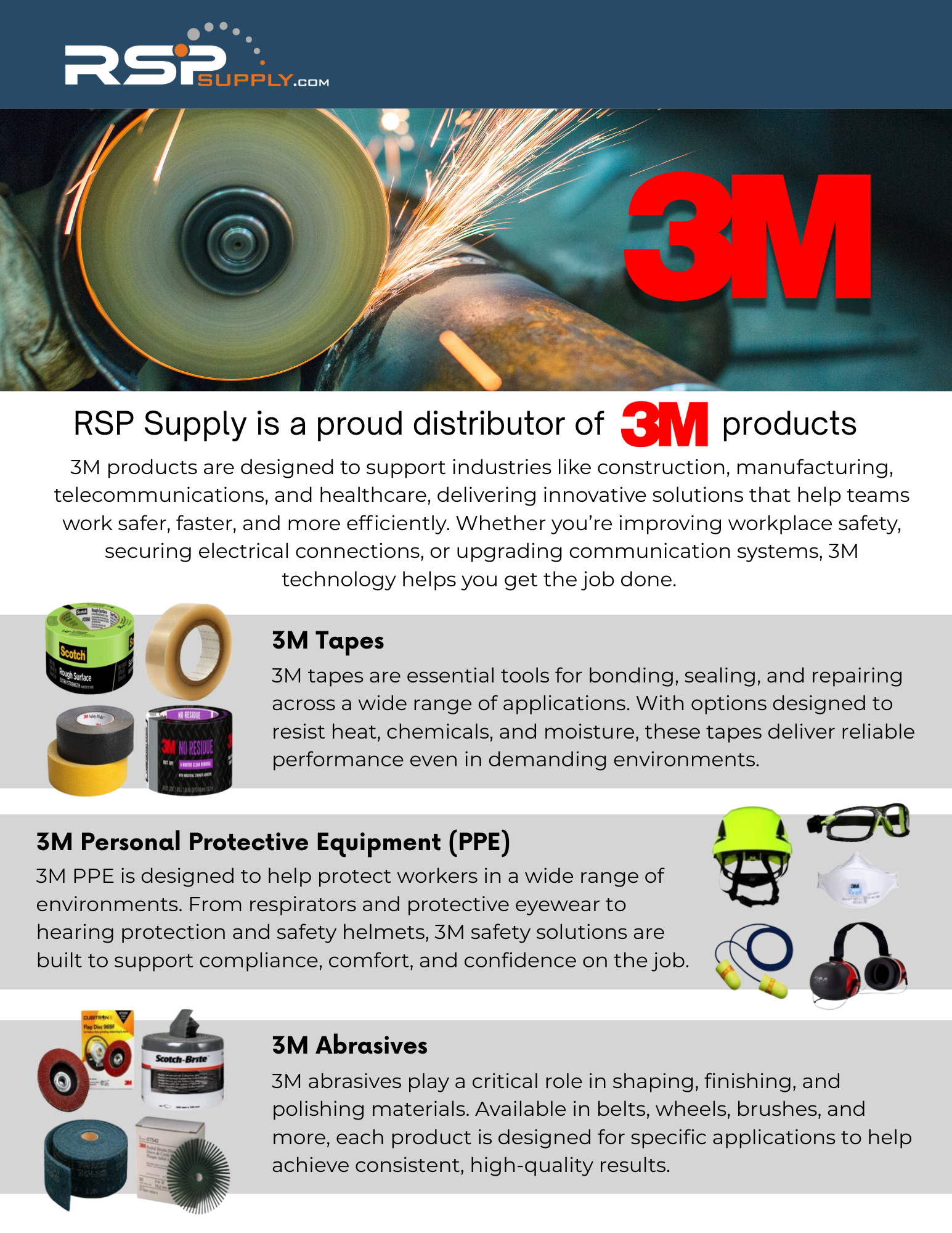 RSP Supply is a proud distributor of 3M products - 3M products are designed to support industries like construction, manufacturing, telecommunications, and healthcare, delivering innovative solutions that help teams work safer, faster, and more efficiently. Whether you’re improving workplace safety, securing electrical connections, or upgrading communication systems, 3M technology helps you get the job done.