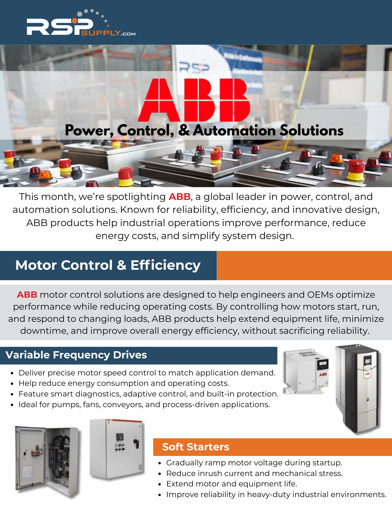 ABB: Power, Control, & Automation Solutions. This month, we're spotlighting ABB, a global leader in power, control, and automation solutions. Known for reliability, efficiency, and innovative design, ABB products help industrial operations improve performance, reduce energy costs, and simplify system design.