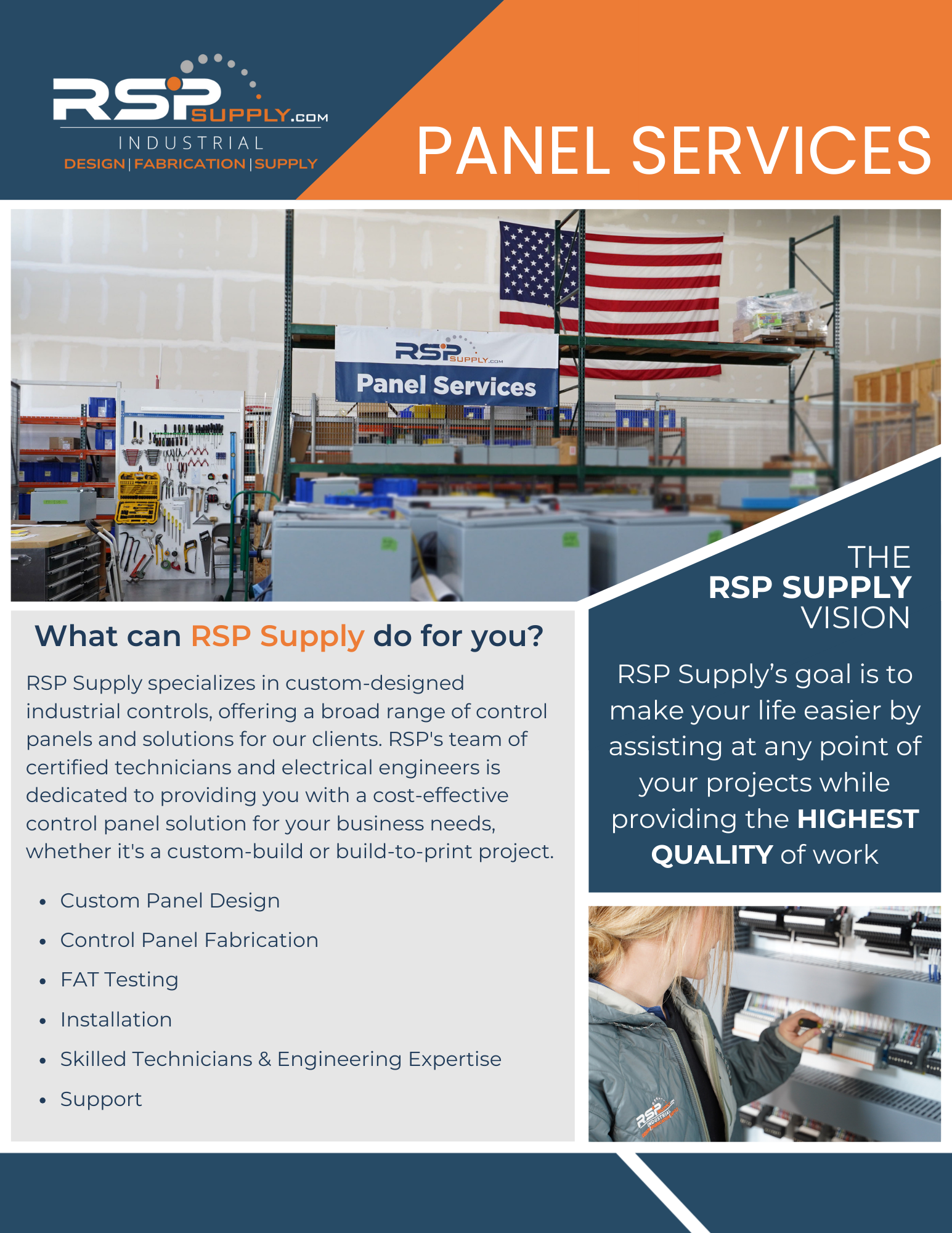 Panel Services - What can RSP Supply do for you? RSP Supply specializes in custom-designed industrial controls, offering a broad range of control panels and solutions for our clients. RSP's team of certified technicians and electrical engineers is dedicated to providing you with a cost-effective control panel solution for your business needs, whether it's a custom-build or build-to-print project.