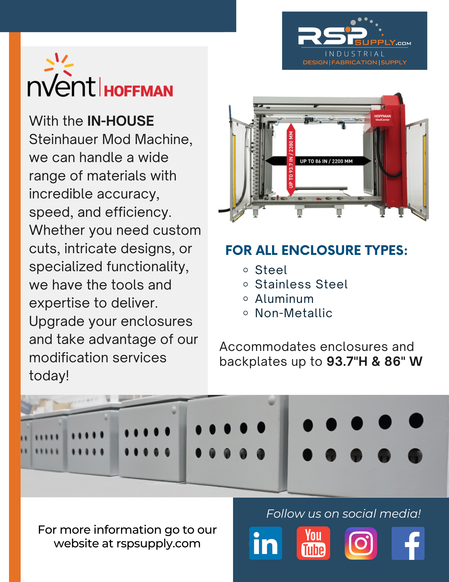 nvent Hoffman - With the in-house Steinhauer Mod Machine, we can handle a wide range of materials with incredible accuracy, speed, and efficiency. Whether you need custom cuts, intricate designs, or specialized functionality, we have the tools and expertise to deliver. Upgrade your enclosures and take advantage of our modification services today!
