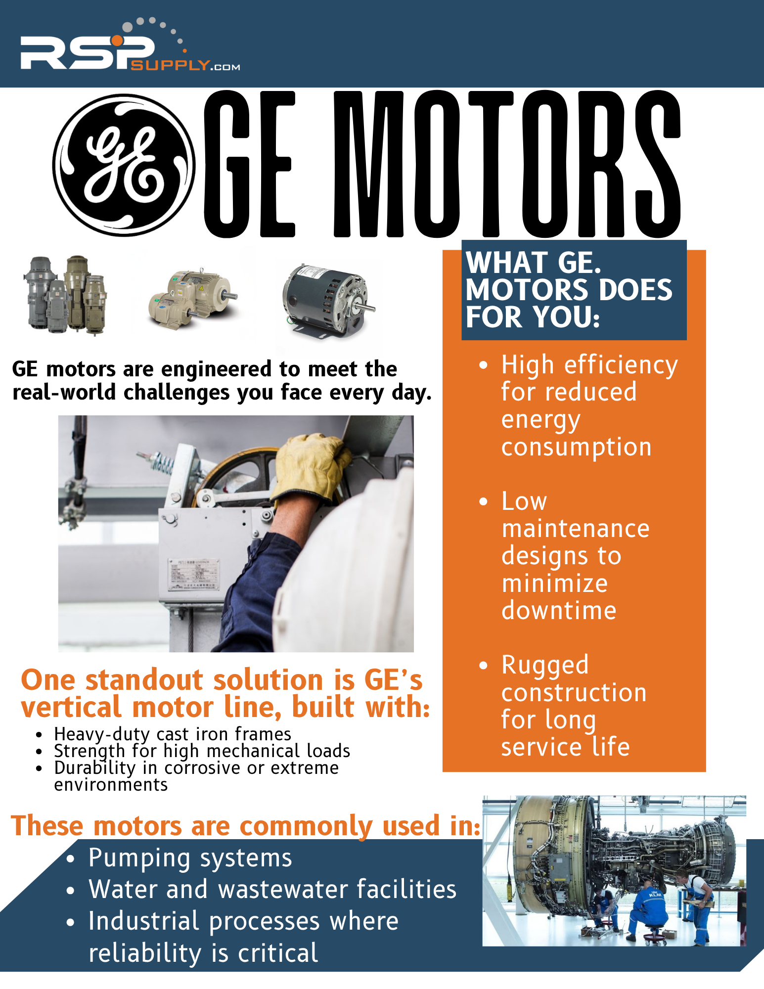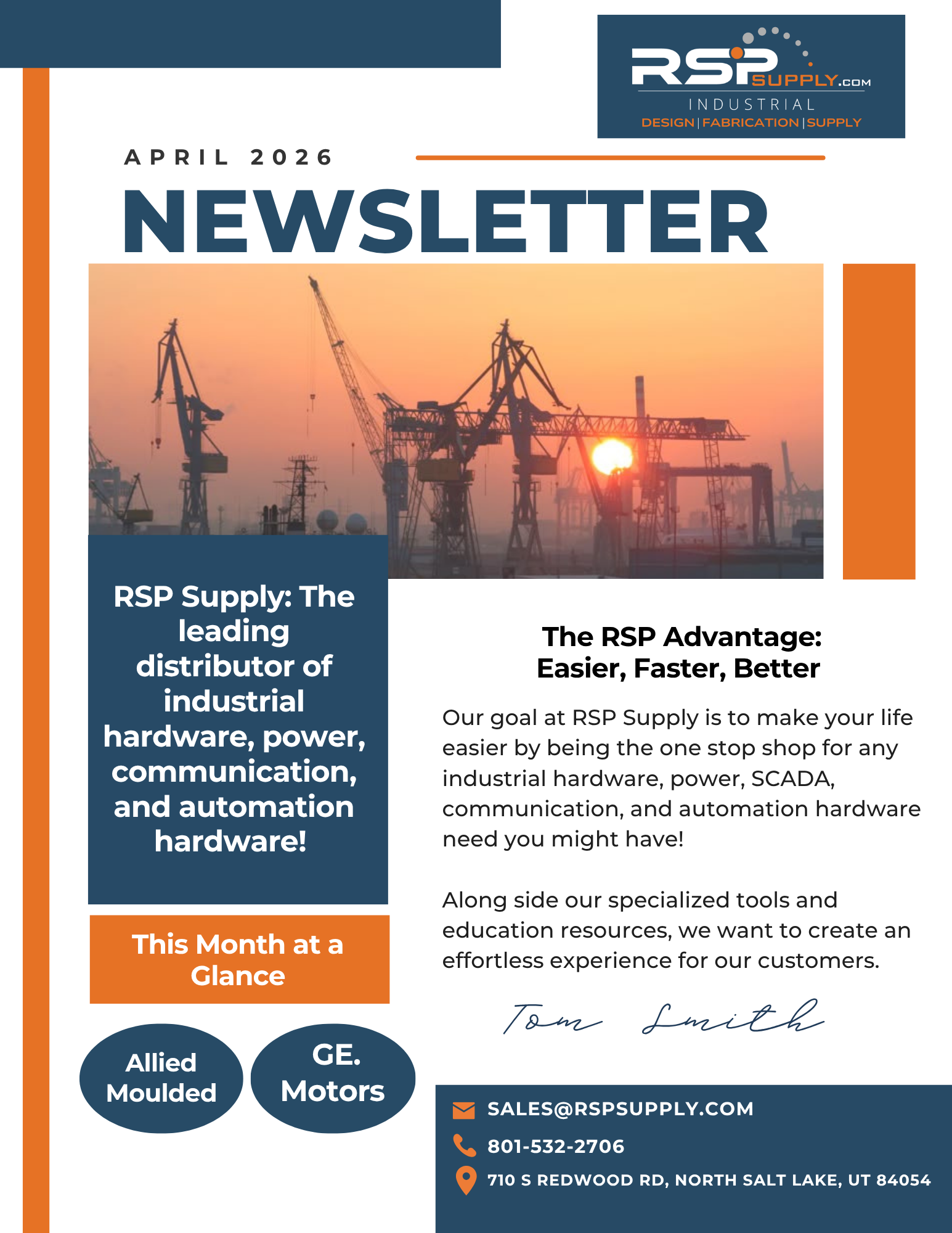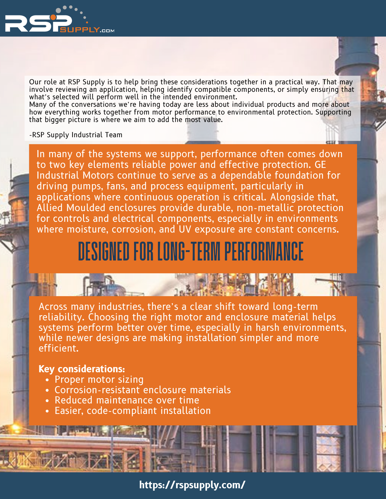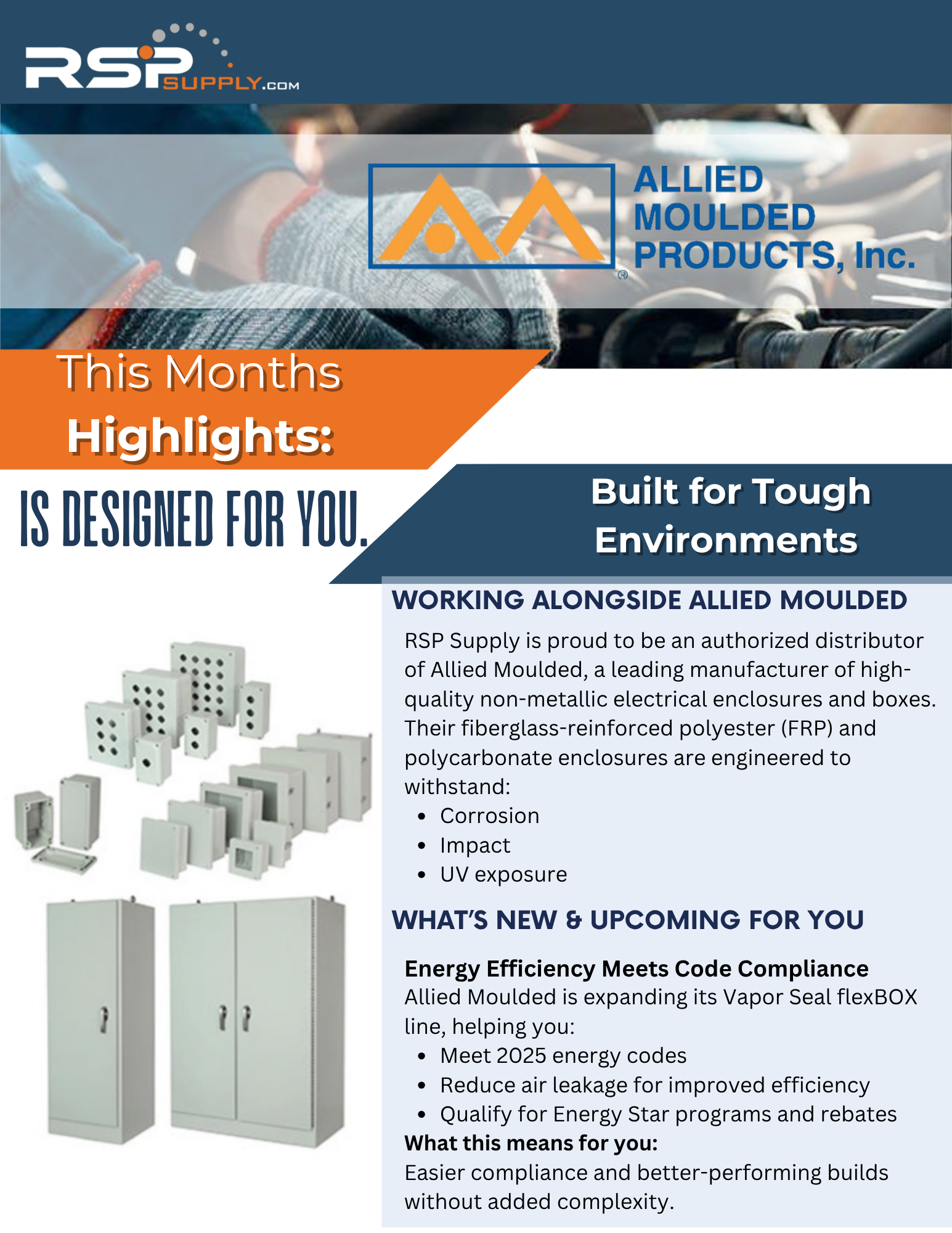 This month’s RSP Supply newsletter highlights dependable industrial solutions designed for long-term performance in tough environments. Featuring Allied Moulded enclosures and GE Industrial Motors, we continue to focus on helping you work easier, faster, and better across your industrial applications.