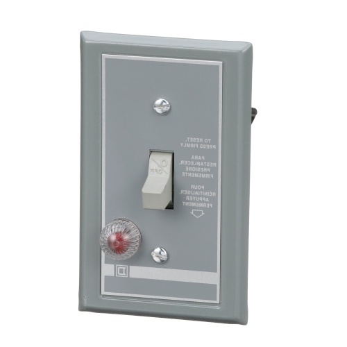 This NEMA 1 flush mounted unit with a gray flush plate can be mounted in a standard switch box or in a machine cavity without a box