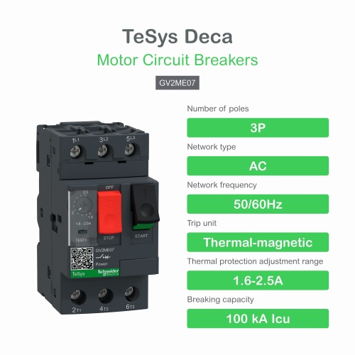 Buy Schneider GV2ME07 2.5 A 1.6-2.5 A 100 kA Icu 230/240 V AC 50/60 Hz IEC 60947-2, 100 kA Icu 400/415 V AC 50/60 Hz IEC 60947-2, 100 kA Icu 440 V AC 50/60 Hz IEC 60947-2, 100 kA Icu 500 V AC 50/60 Hz IEC 60947-2, 3 kA Icu 690 V AC 50/60 Hz IEC 60947-2 0.75 kW 400/415 V AC 50/60