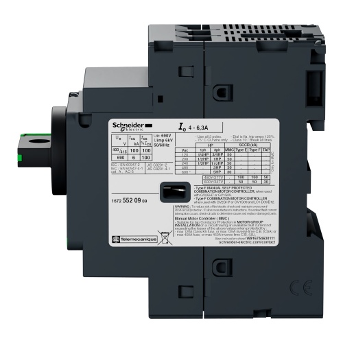 TeSys GV2 Manual Starter and Protector, thermal magnetic circuit protector, rotary handle, 4 to 6.3 A, screw clamp