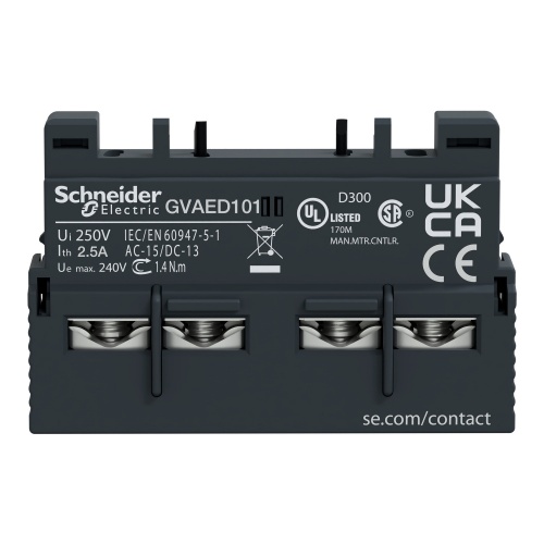 Buy Schneider GVAED101 Auxiliary contact block screw clamp terminals 1 0.00-0.00 in² (1-2.5 mm²solid, screw clamp terminals 2 0.00-0.00 in² (1-2.5 mm²solid, screw clamp terminals 1 0.00-0.00 in² (0.75-2.5 mm²flexible without cable end, screw clamp terminals 2 0.00-0.00 in² (0.75- (MUST BUY IN PACKS OF 10)