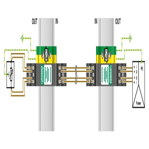 Phoenix Contact 2839402 The protective plug is designed as the base element for a protective circuit in a 4-wire floating signal circuit with a bridge connecting the GND connections at pins 3-4 and the power connections at pins 9-10. The plug is suitable for mounting on NS 35/7.5 and NS 35/15 enclosures, with a housing width of 17.5 mm.