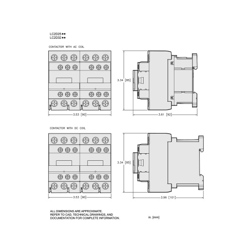 Schneider LC2D32E7 Reversing contactor Power circuit 690 V IEC 60947-4-1, Power circuit 600 V CSA, Power circuit 600 V UL, Signalling circuit 690 V IEC 60947-1, Signalling circuit 600 V CSA, Signalling circuit 600 V UL Control circuit screw clamp terminals 1 0.00-0.01 in² (1-4 mm