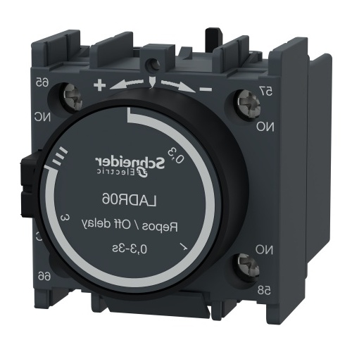 Buy Schneider LADR06 Time delay auxiliary contact block TeSys D CAD, TeSys D LC1D, TeSys F LC1F, TeSys F CR1F TeSys D 23-140 °F (-5-60 °C 690 V IEC 60947-5-1, 600 V UL, 600 V CSA lugs-ring terminals 0.31 in (8 mm 1 NO + 1 NC Off delay 10 A 140 °F (60 °C 140 A AC, 250 A DC EN/IEC