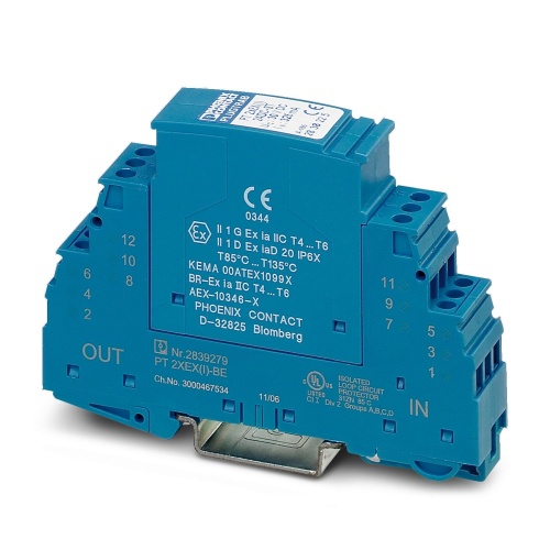 PT 2XEX(I)-BE Phoenix Contact Transient Surge Suppressor PT 2XEX(I)-BE Base element for protective plug PT with protective circuit for two 2-core floating EEx ia signal circuits. Mounting on NS 35/7.5 and NS 35/15.