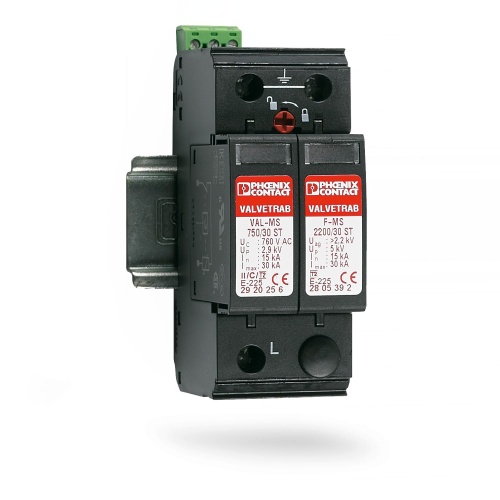 VAL-MS 800/30 VF/FM Phoenix Contact VAL-MS 800/30 VF/FM Surge arrester consisting of 2-channel base element with remote indication contact and protective plugs connected in series with a varistor and a gas-filled spark gap.
