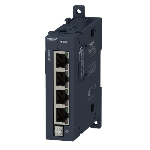 Schneider TM4ES4 Ethernet unmanaged switch Modicon M241 logic controller, Modicon M251 logic controller 10BASE-T/100BASE-TX - 4 copper cable RJ45 4 connectors for connecting Ethernet network, Screw connector terminal for connecting the functional ground Ethernet 4 RJ45 Top hat type TH35-15 rail IEC 60715, Top hat type TH35-7.5 rail IEC 60715, plate or panel with fixing kit Ethernet IP/Modbus TCP, TCP (Transmission Control Protocol, UDP (User Datagram Protocol, SNMP IP20 with protective cover in place PLC Programmable Logic Controllers Modicon M241 Micro PLC Communication module